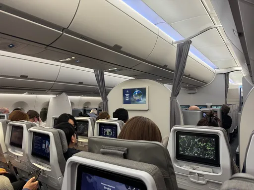 Melkein heti tuli aika nousta koneeseen. Tämä oli Finnairin laivaston parhaimmistoa, Airbus A350 XWB 3+3+3-konfiguraatiossa. Uskoakseni kaikki 278 paikkaa olivat täynnä. Thai käyttää samaa kalustoa pitkän matkan lennoillaan. Portilla skannattiin passi ja lentolippu, mutta niiden lisäksi siellä ei punnittu, tutkittu, tarkastettu tai kysytty mitään. Ei siis viisumia, paluulippua tai DTACiä. Marssin sisään koneeseen ja istuin keskipenkille. Sellaiselle minut oli arvottu, ja istuimen vaihtaminen paremmaksi olisi maksanut yli 100€ tai toiselle keskipenkille 75€.