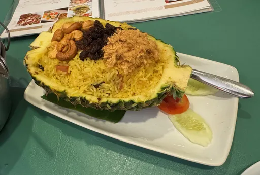 Ravintola oli suuri ja melko hieno. Annoin vuokraemännälläni lahjaksi pienen kiven, jonka olin raahannut tänne mukanani Mordorista. Sanovat sitä spektroliitiksi. He näyttivät minulle valokuvia hiljattaiselta matkaltaan Kiinaan. Siellä oli ollut sekä hienoja luontokohteita että edullinen hintataso. Ruuaksi tilattiin jonkinlainen kala, jättiläiskatkarapuja ja paistettua riisiä ananaksessa.
