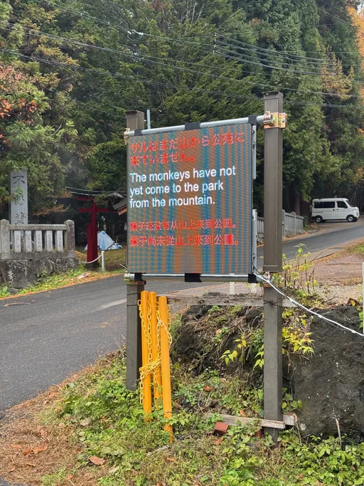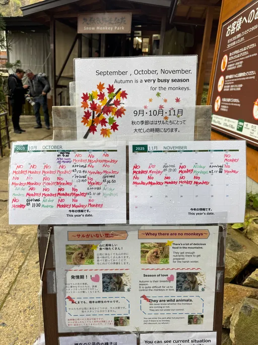Tässä kansallispuistossa on kuulemma tavattavissa eläin, jota kutsutaan tässä kylässä useimmiten nimellä sunoo monkii. Jopa tänne vievä juna oli nimeltään sunoo monkii ekusupuresu (スノーモンキーエクスプレス). Jo parkkipaikalla oli kuitenkin kyltti, jossa luki, että sunoo monkiita ei ole vielä näkynyt vaan ne ovat jossain vuorilla ja tulevat kansallispuistoon vasta kylmällä säällä.