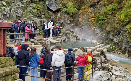 Kävelin vielä vähän matkaa, ja edessä näkyi turistirevohka kuvaamassa innokkaasti jotakin. Sunoo monkiihan se siellä, tai oikeammin japaninmakaki kuuman altaan reunalla istumassa. Tämä on ainoa paikka koko maailmassa, jossa japaninmakakit kylpevät kuumissa lähteissä. Joku oppi taidon 60-luvulla, ja sen jälkeen muut lauman jäsenet tekivät perässä. Ilmeisesti ne kuitenkin kylpevät ainoastaan talvisaikaan, eivät käytännössä koskaan muulloin.