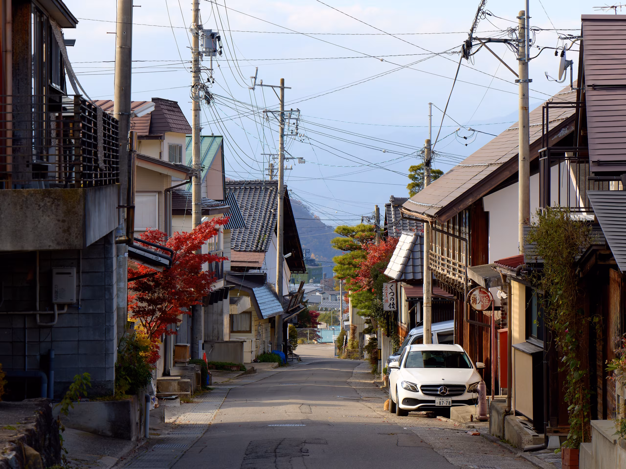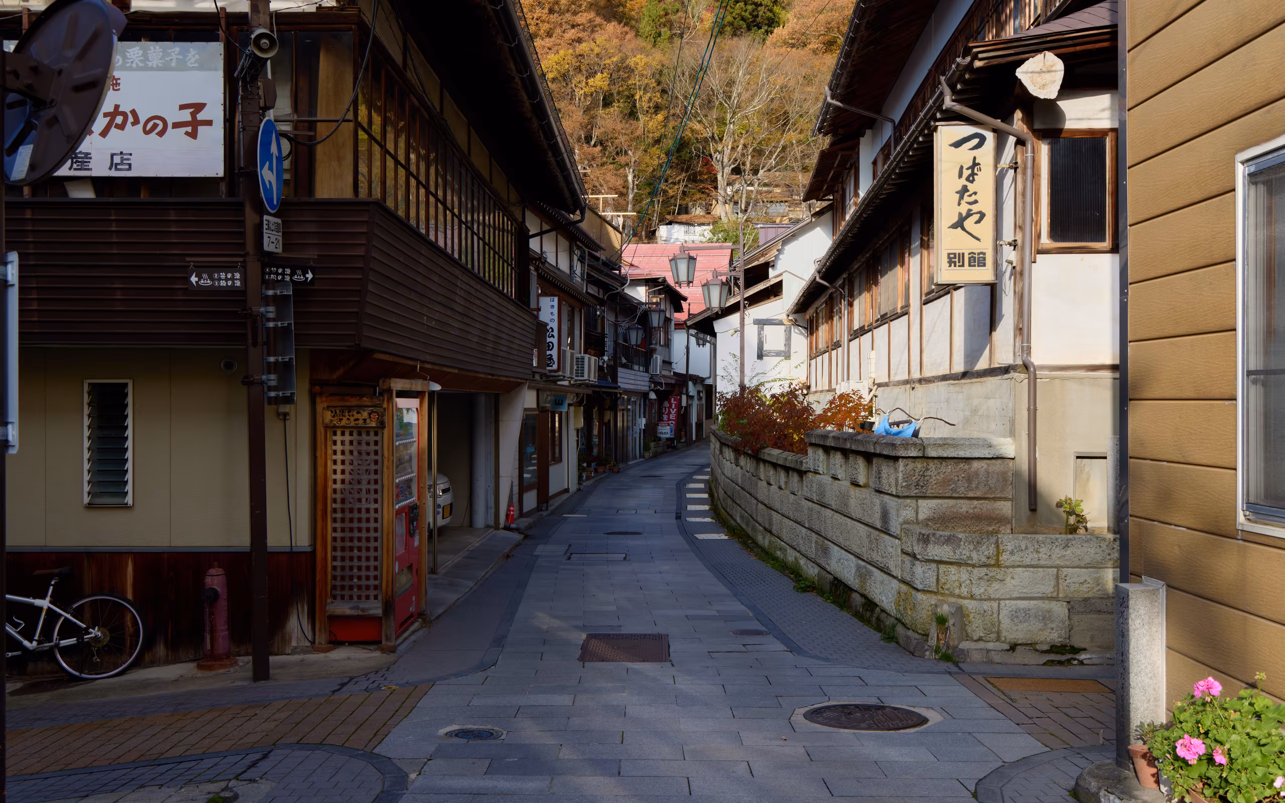 Syötyäni päätin kävellä rautatieasemalle 7-Eleveniin. Siinä menisi Google Mapsin mukaan noin 47 minuuttia. Otin kuitenkin matkalla niin paljon kuvia kylästä, ympäröivistä vuorista ja kylän keskellä kulkevasta joesta että olin tuossa vaiheessa vasta puolivälissä matkaa. Tajusin, että olin aivan ryokanini vieressä. Päätin unohtaa 7-Elevenin toistaiseksi, ruokaa sai ryokanistakin.