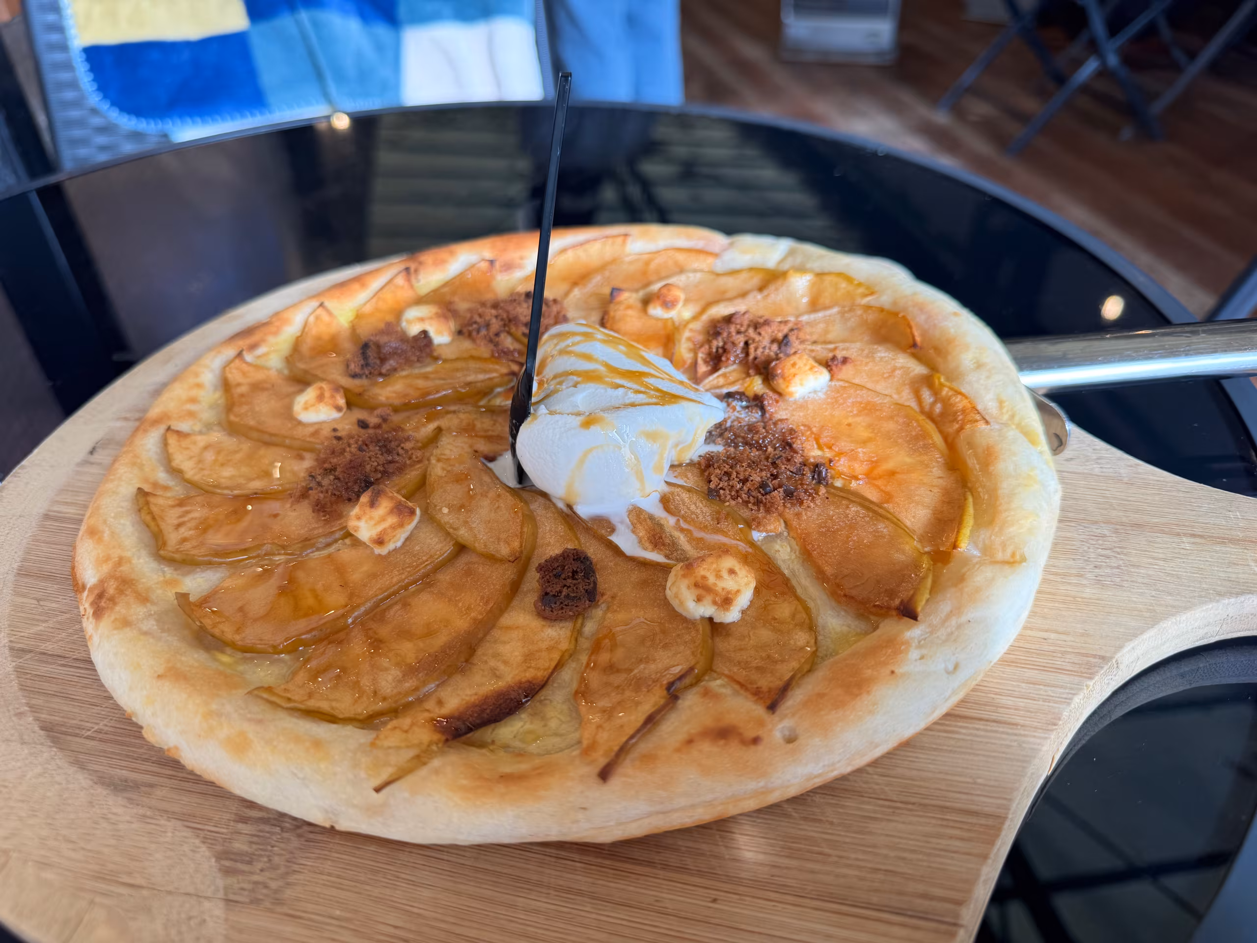 Palasin takaisin parkkipaikalle ja menin siellä olevaan ravintolaan. Tilasin paikallisen erikoisuuden, “omenapizzan”. Se oli oikeastaan makea omenapiirakka, ja varsin hyvä sellainen.