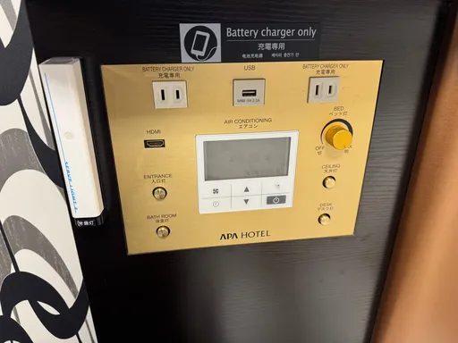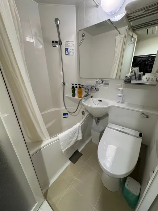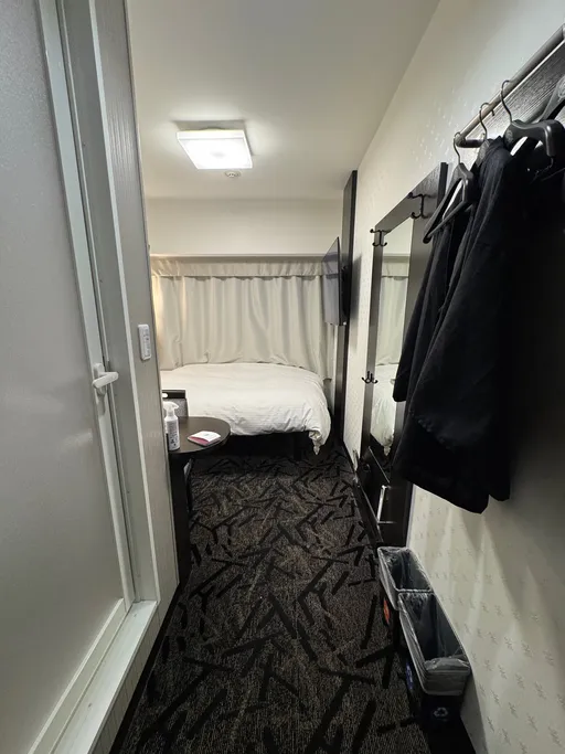Menin hissillä kymmenenteen kerrokseen. Huoneeni oli pieni, mutta siellä oli suihku, kylpyamme, jääkaappi, yukata ja 55-tuumainen televisio, joka alkoi näyttää tervetuloinformaatiota. Television mukaan kylpylä oli toisessa kerroksessa ja siellä oli myös kolikkopesukoneita. Televisio kertoi myös wifi-verkon salasanan, onsenin senhetkisen väkimäärän ja uloskirjautumisajan. Kaikkia valoja pystyi säätämään paneelista, joka oli kiinnittetty sängyn päätylevyyn. Vaikutti siltä, että tässä majoitusliikkeessä mitään yksityiskohtaa ei ole jätetty sattuman varaan.