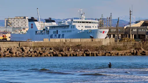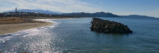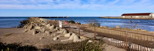 Aallonmurtajan toisella puolella oli jonkinmoinen joensuu. Joessa seisoi useita japanilaisia kalastamassa. Myös aallonmurtajan nokassa oli pari japanilaista kalastamassa. Dokumentoin alueen. Paikalla oli myös risteilyalussatama. Sellaisella olisi kai päässyt läheiseen saareen.