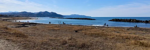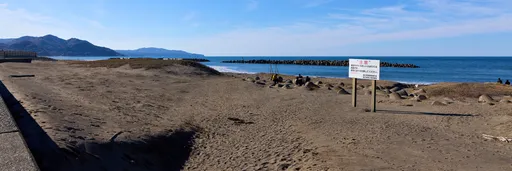 Saavuin hiekkarannalle. Hiekka oli tummaa ja vulkaanisen näköistä. Uiminen oli ankarasti kielletty merivirtojen takia. Täällä oli nähtävissä muutamia japanilaisia sunnuntaipäivää viettämässä.