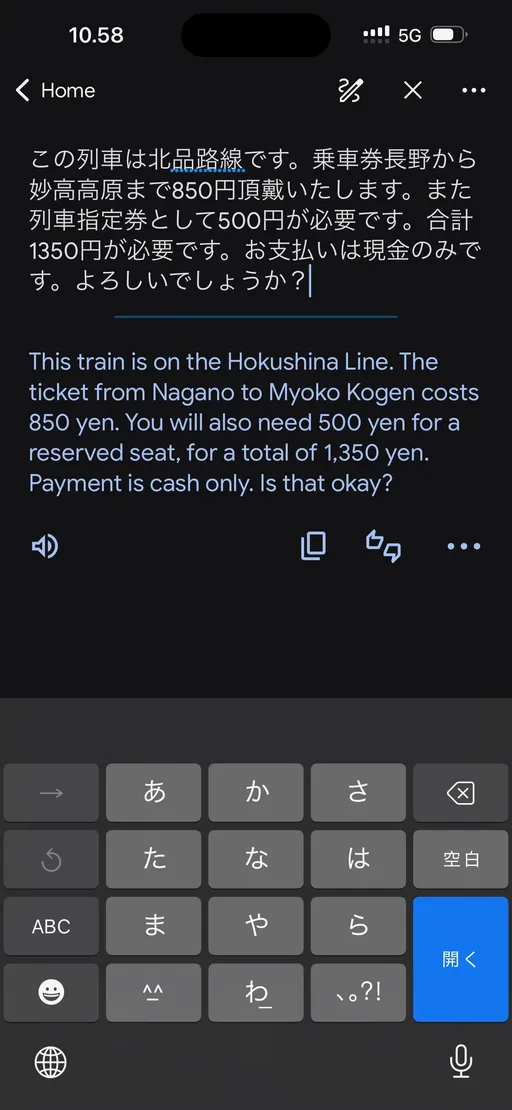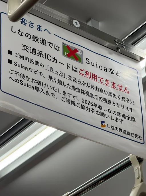Sain kuulla, että tätä nimenomaista junamatkaa ei voi maksaa IC-kortilla, vaikka tänne olikin kuljettu maksuportin läpi. Tämä on nähkääs yksityisen Shinano Railway Co., Ltd:n liikennöimä juna, ei JR:n juna. Palvelu oli vahvasti japaninkielistä, ja sain siitä selvää vasta, kun se oli syötetty Google Translaten läpi. Sain onneksi ostaa junalipun paikan päällä (850 jeniä lipusta ja 500 paikasta). Mordorissa olisi varmaan heitetty niskaperseotteella junasta ulos, eikä välttämättä odotettu edes junan pysähtymistä sitä ennen.