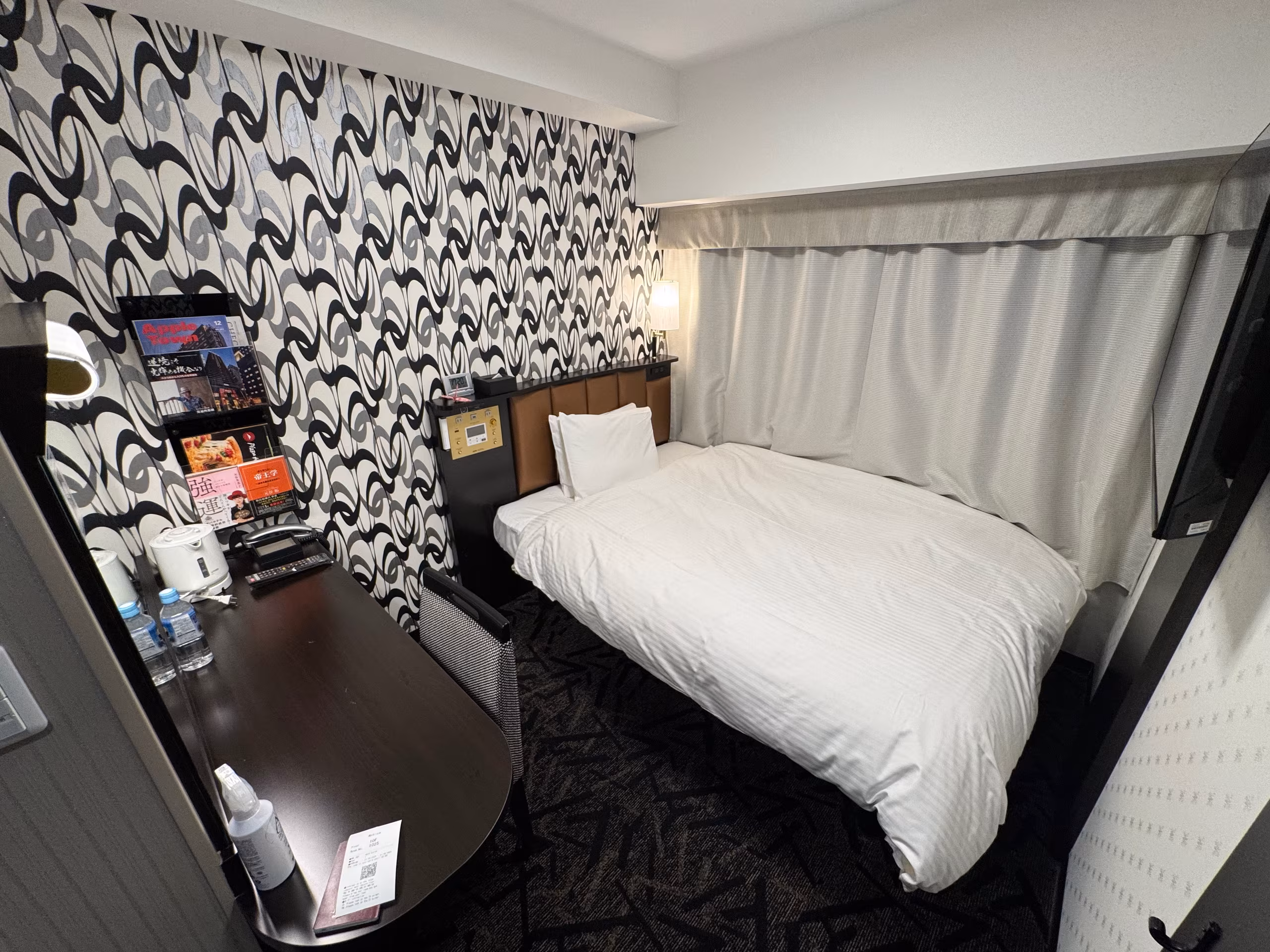 Menin hissillä kymmenenteen kerrokseen. Huoneeni oli pieni, mutta siellä oli suihku, kylpyamme, jääkaappi, yukata ja 55-tuumainen televisio, joka alkoi näyttää tervetuloinformaatiota. Television mukaan kylpylä oli toisessa kerroksessa ja siellä oli myös kolikkopesukoneita. Televisio kertoi myös wifi-verkon salasanan, onsenin senhetkisen väkimäärän ja uloskirjautumisajan. Kaikkia valoja pystyi säätämään paneelista, joka oli kiinnittetty sängyn päätylevyyn. Vaikutti siltä, että tässä majoitusliikkeessä mitään yksityiskohtaa ei ole jätetty sattuman varaan.