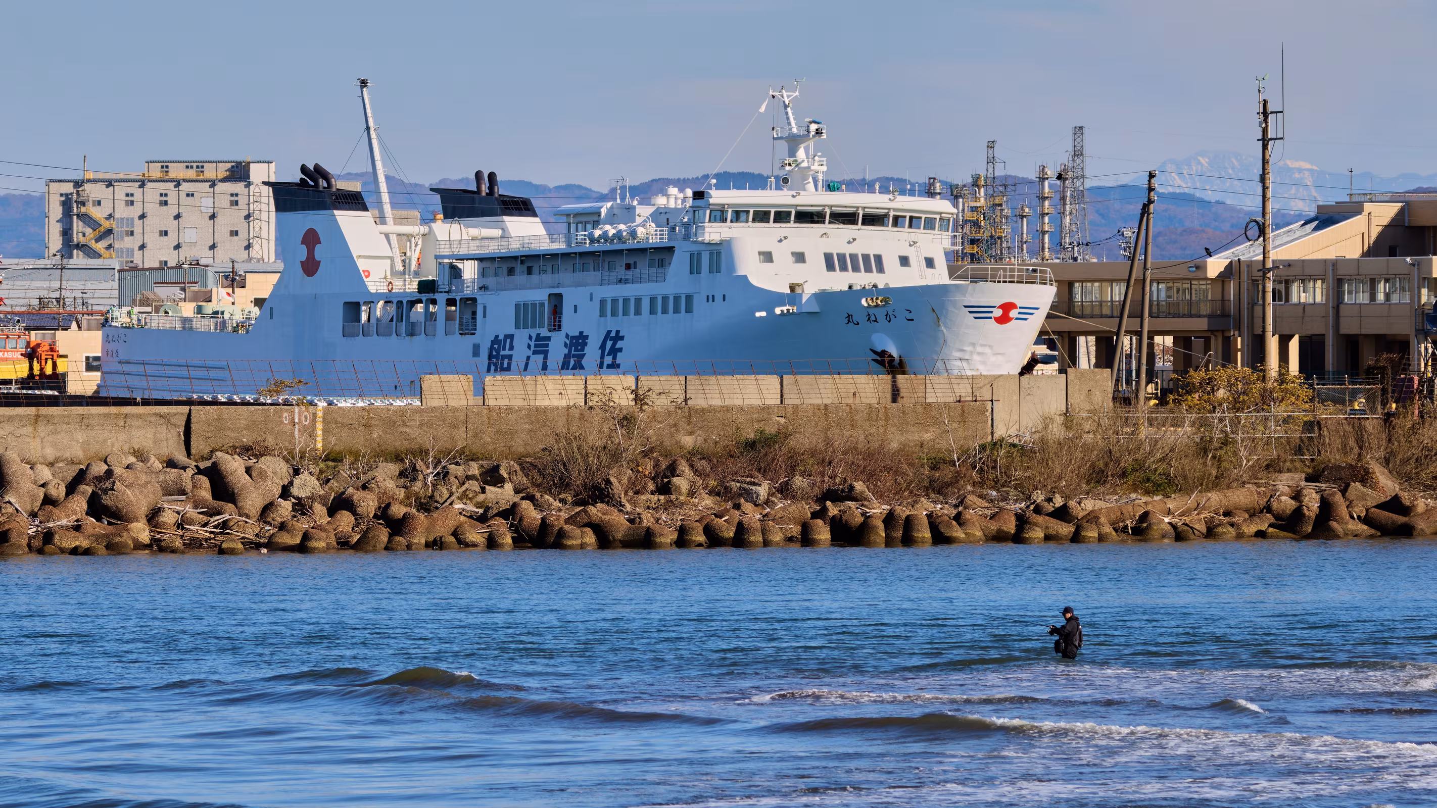Aallonmurtajan toisella puolella oli jonkinmoinen joensuu. Joessa seisoi useita japanilaisia kalastamassa. Myös aallonmurtajan nokassa oli pari japanilaista kalastamassa. Dokumentoin alueen. Paikalla oli myös risteilyalussatama. Sellaisella olisi kai päässyt läheiseen saareen.