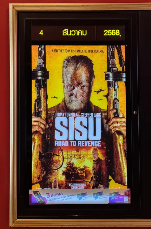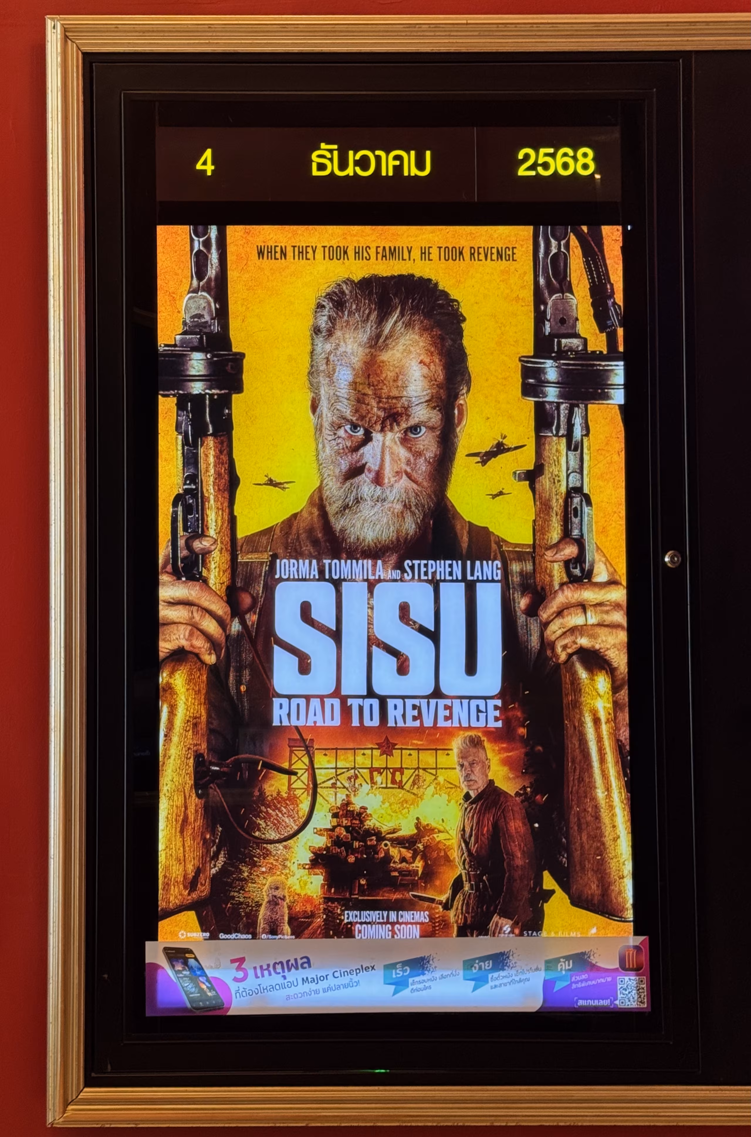 Jätin mopon Lotuksen parkkipaikalle ja lähdin etsimään henkareita. Kävelin elokuvateatterin ohi. Siellä oli tulossa ensi-iltaan Sisu - Road to Revenge.