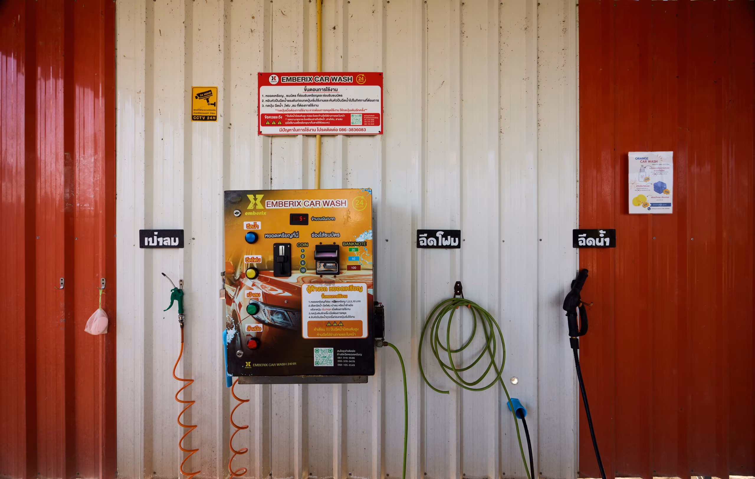Joka tapauksessa, ajoin sitten itsepalvelupesulaan. Neljän auton tallissa oli seinässä kolikkoautomaatti, josta sai tekstien mukaan vettä, pesuainetta ja paineilmaa kuivaukseen.