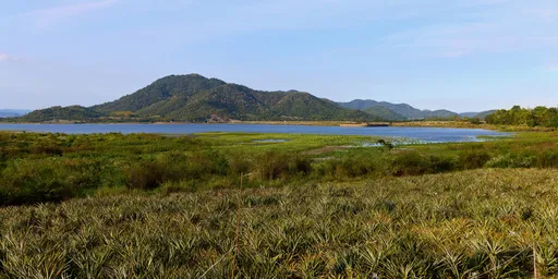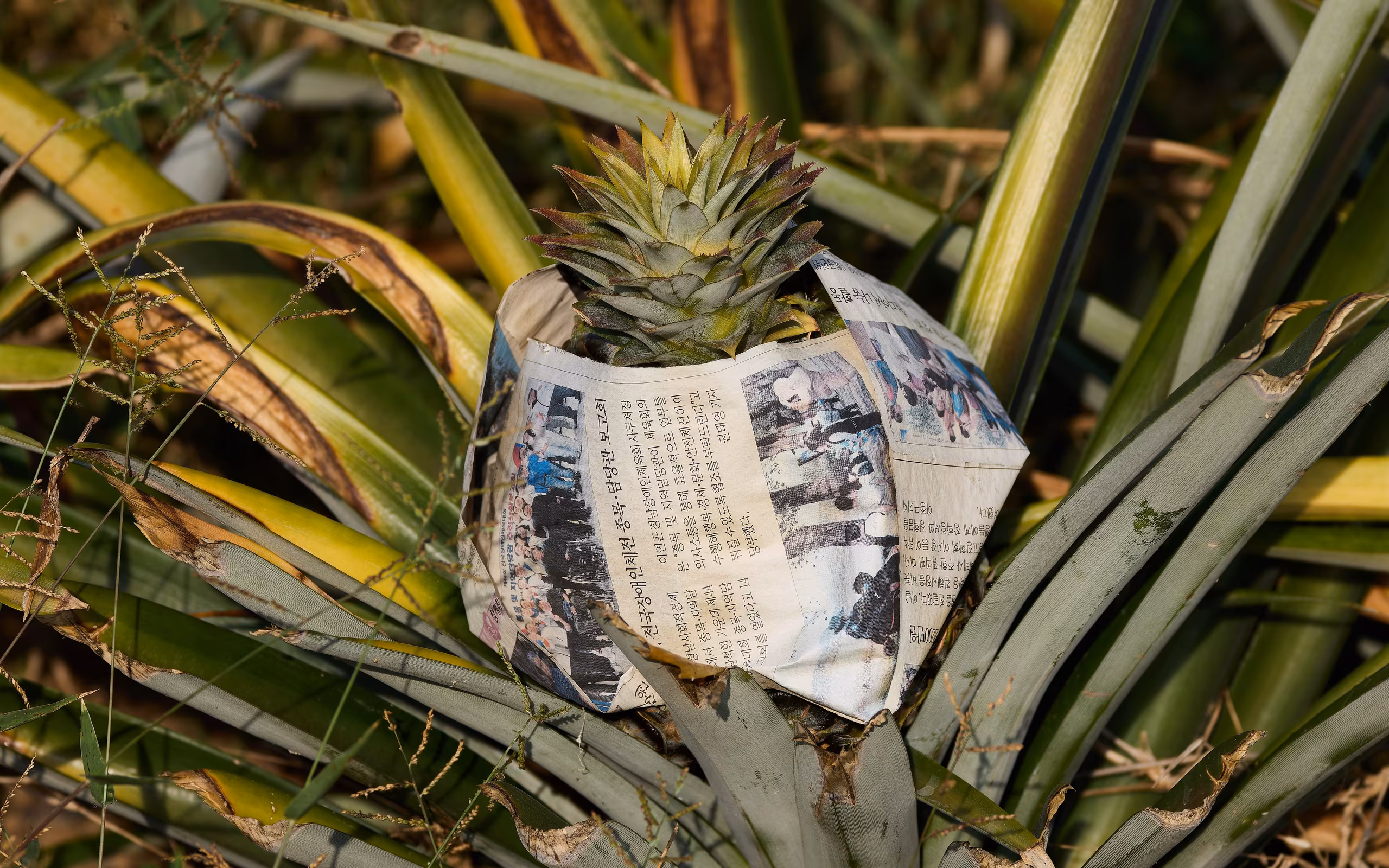 Alueella oli runsaasti ananasviljelmiä. Vaikutti siltä, että joku oli käärinyt pelloilla kasvavat tuhannet puolikypsät ananakset sanomalehtiin. Sangen merkillistä. Dokumentoin tällä tavoin verhotun ananaksen.