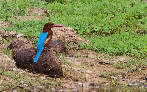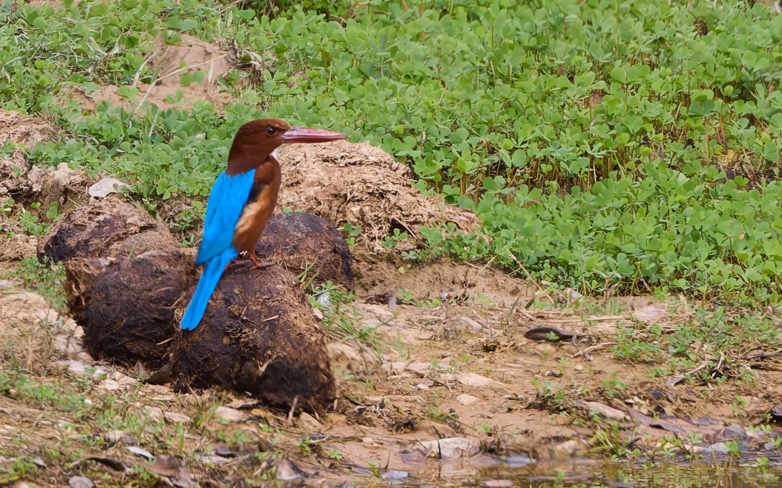 Autot olivat pysähtyneet pienen lammikon eteen. Siellä oli jokin tumma kasa, jota tarkastelin kamerani läpi. Kasa oli tuore norsunläjä, ja sen päällä istuskeli kuningaskalastaja. Dokumentoin kuningaskalastajan. Pysähdyimme sitten lyhyesti pienelle aukealle, josta avautui näkymä ympäröivälle savannille. Siellä ei kuitenkaan ollut mitään eläimiä. Lähdimme jatkamaan matkaa.