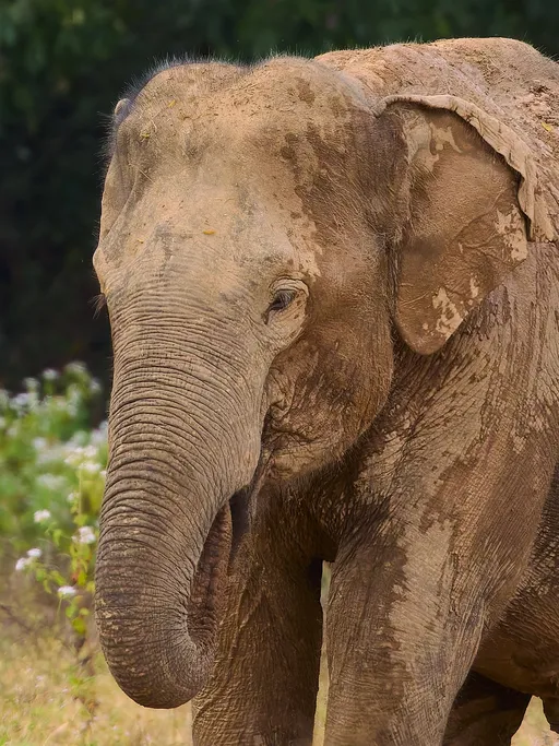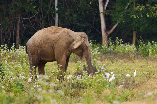 Emme olleet kuitenkaan vielä ehtineet edes autolle, kun opas sai radiopuhelimeensa tiedon, että alueelle oli tulossa norsu. Teimme U-käännöksen. Paikalle taapersi komea urosnorsu, jolla oli suuret syöksyhampaat. Ensimmäinen norsu oli ollut syöksyhampaaton naaras. Toisin kuin afrikannorsunaaraille, asiannorsunaaraille ei kasva varsinaisia syöksyhampaita.