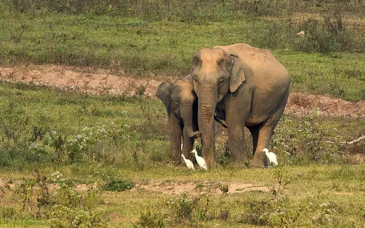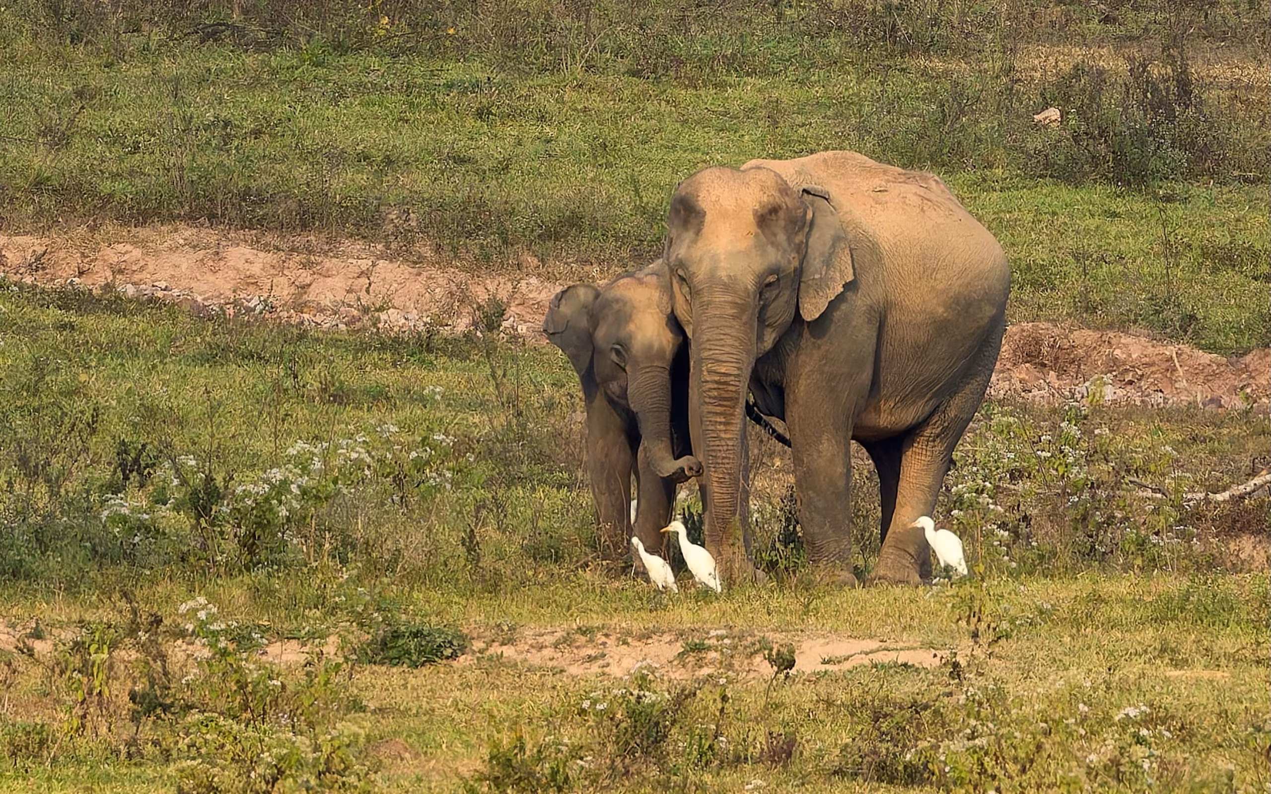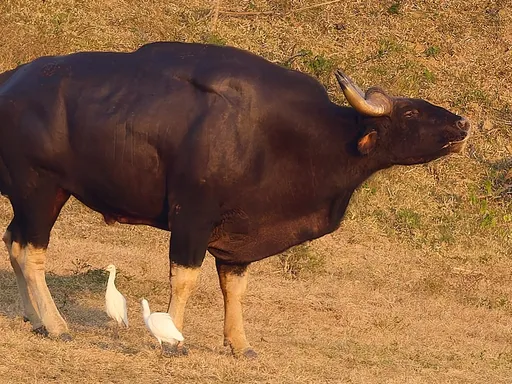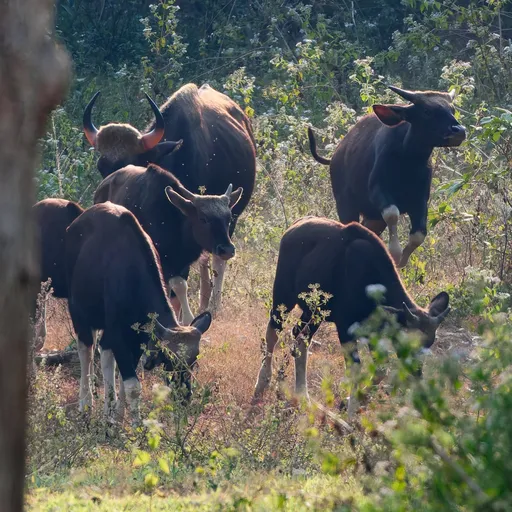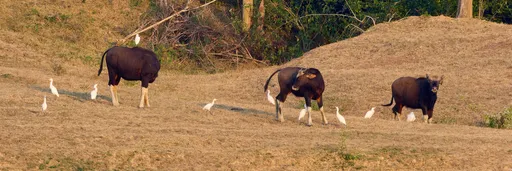 Aikamme istuskeltuamme paikalle alkoi tulla gaureja. Ne köpöttivät paikalle metsän reunasta siistissä jonossa ja niitä seurasi useita lehmähaikaroita. Yksi haikara meni niin pitkälle, että istahti gaurin selän päälle istumaan. Lopulta paikalla oli ainakin tusinan gaurin lauma. Lisää tuli vielä siinäkin vaiheessa, kun olimme jo poistumassa.