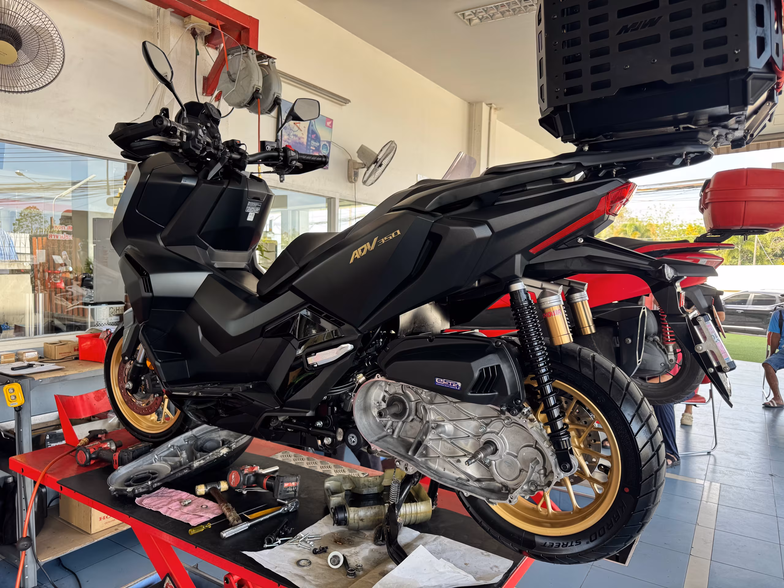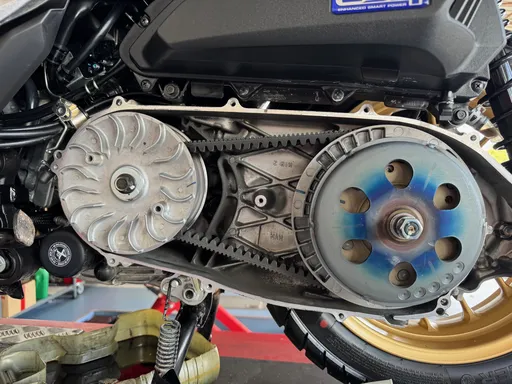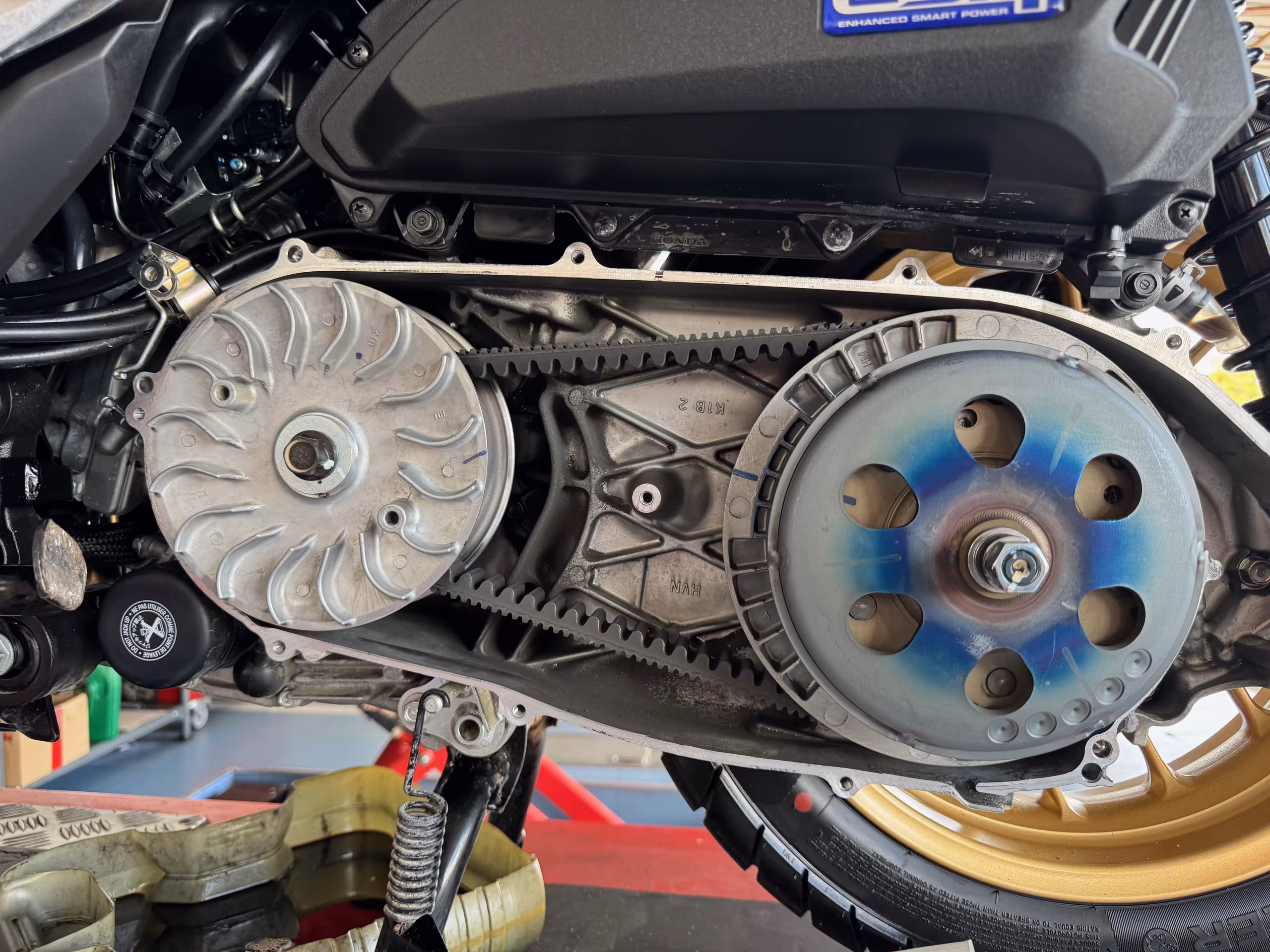 Vuoroni tuli. Honda-paitainen mies poisti ensin mopon pohjasta pultin ja vaihtoi öljyt. Sitten hän otti pulttipyssyn esille ja purki katsellessani koko CVT-vaihteiston alkutekijöihinsä. Hän otti jonkin kupin muotoisen variaattorin osan käteensä ja heitti siellä olevan mustan mönjän asfaltille. Sitten kaveri laittoi maskin päähänsä ja puhalteli paineilmalla puhtaaksi niin osat kuin variaattorin kotelonkin. Jokainen puhallus sai aikaan suuren pölypilven. Lopuksi hän puhdisti kotelon vielä jollakin öljyllä ja ruuvasi sen sitten takaisin kiinni.