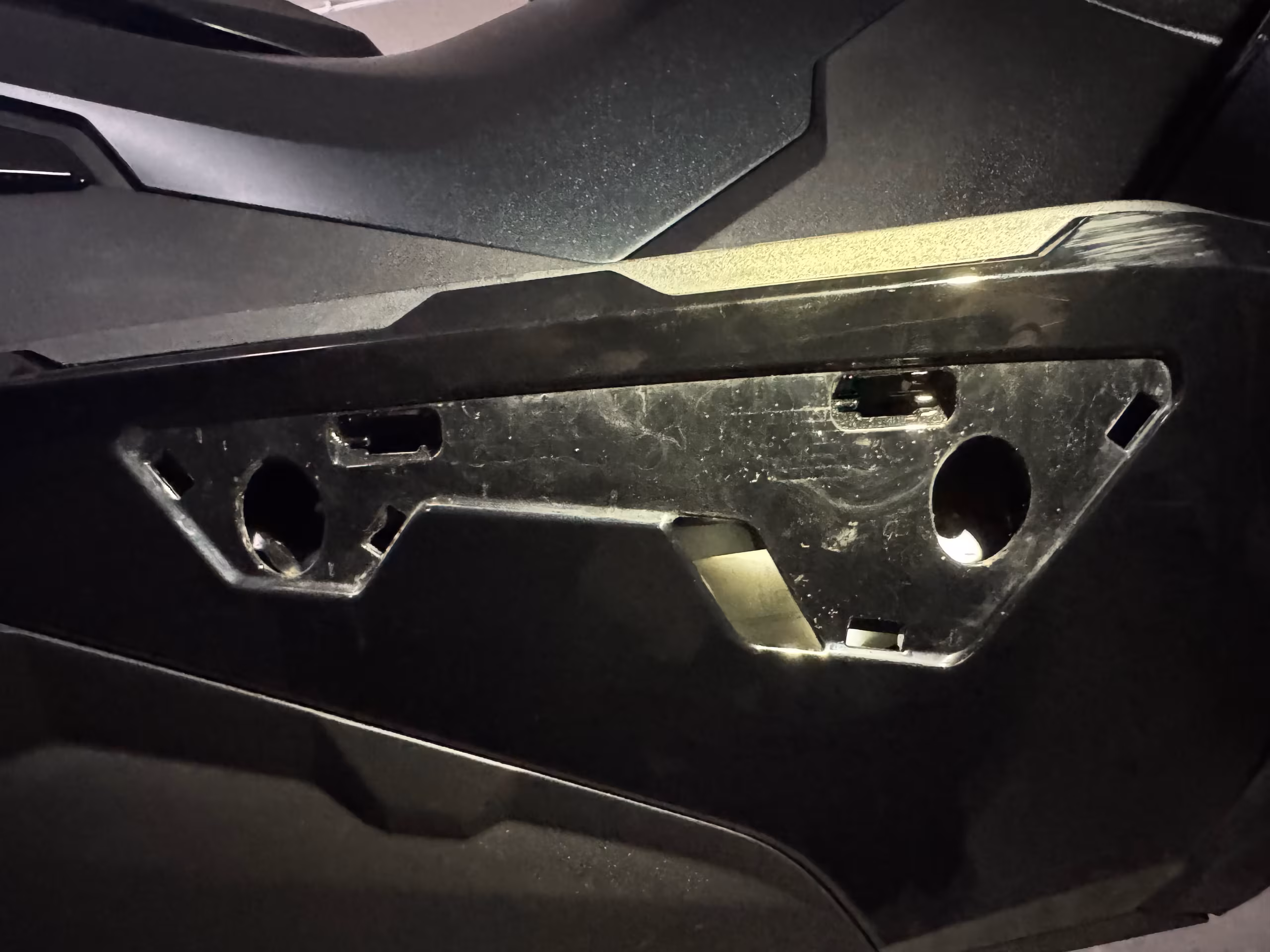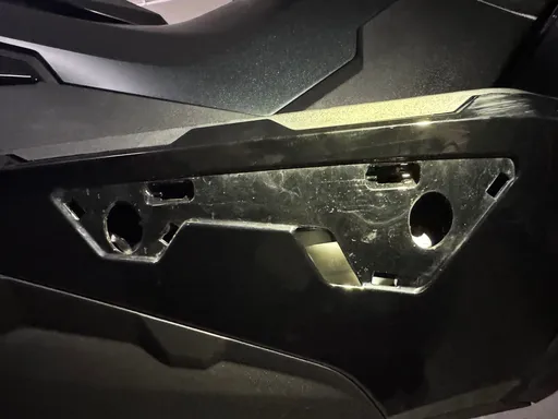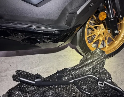 Pyöräni oli siis ADV 350 vuosimallia 2025. Tämä teki asennuksesta erilaista kuin edellisissä malleissa. Poistin ensin jalkojen alla olevat matot ja sen jälkeen niiden alla olevat neljä ruuvia. Näin pystyin osittain irrottamaan jalkojen alla olevan pohjapaneelin.